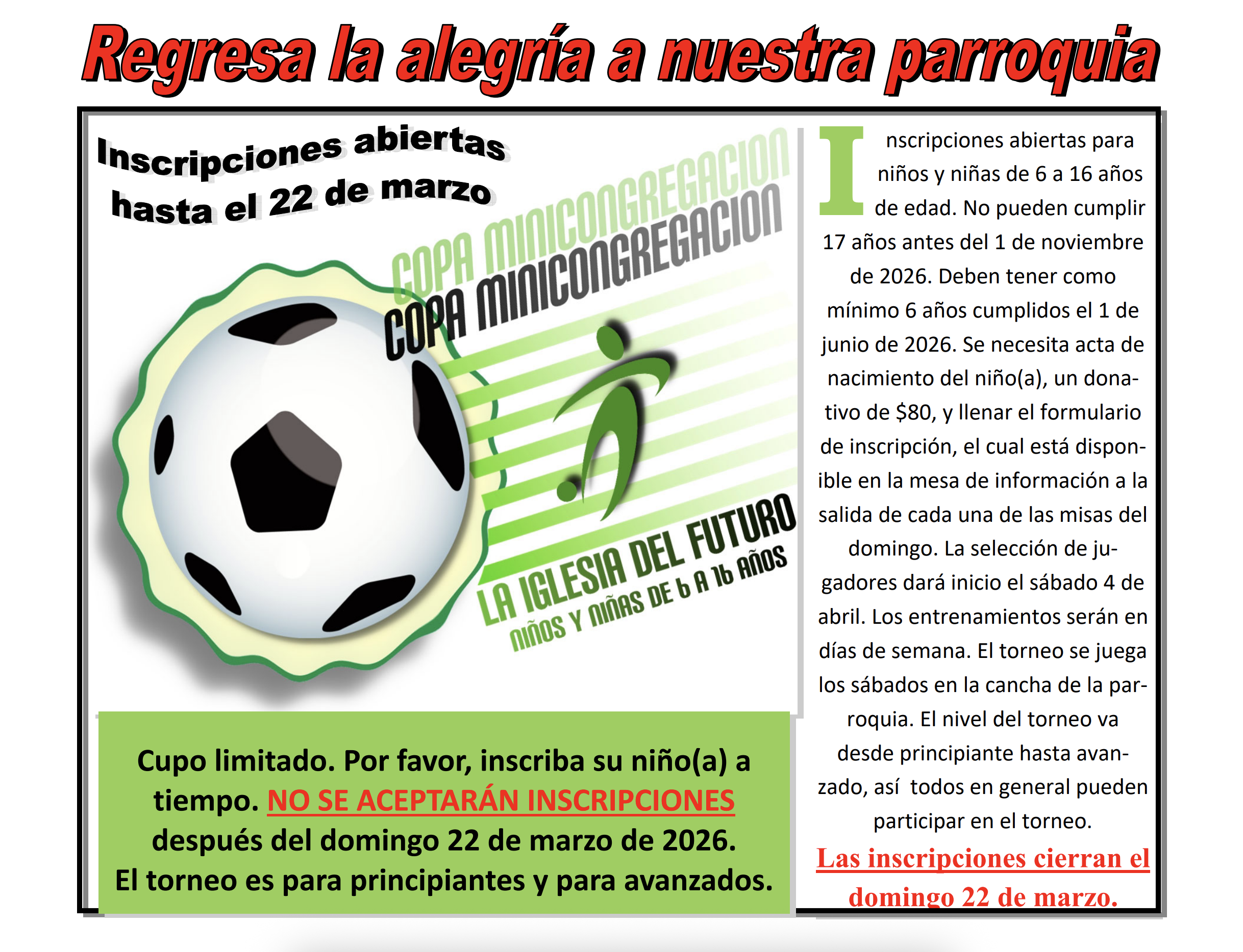 Regresa la alegria a nuestra parroquia! Inscripciones abiertas para niños y niñas de 6 a 16 años de edad.